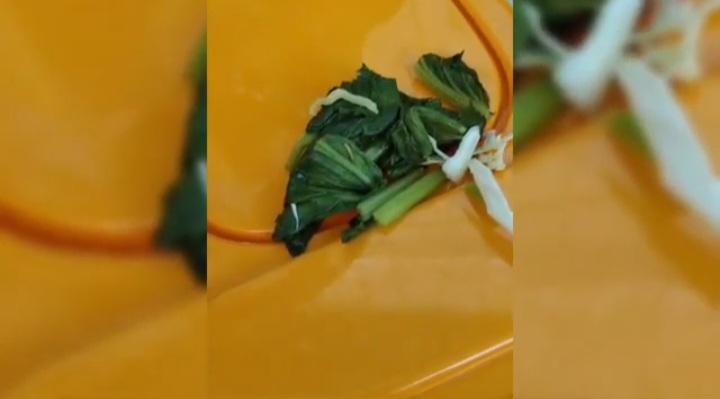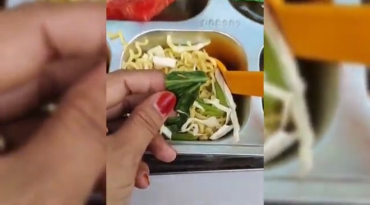 Video berdurasi 19 detik ini memperlihatkan ulat masih melekat di sayuran yang disajikan bersama mie instan sebagai lauk pendamping.