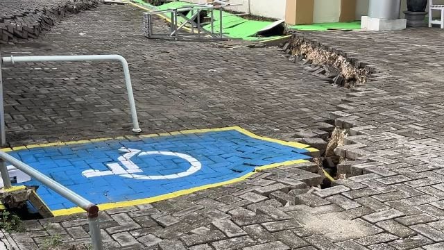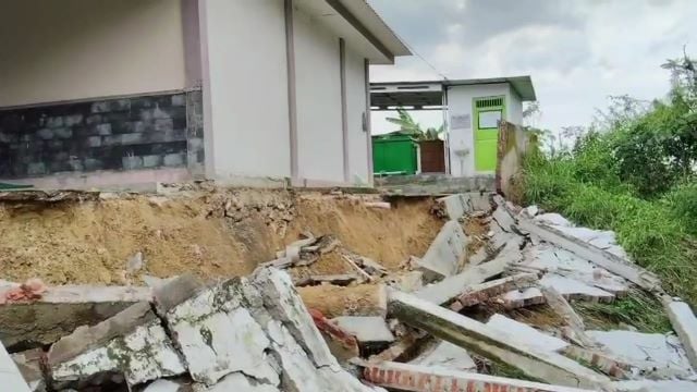 Tanah di area belakang bangunan tergerus air sungai, mengakibatkan pagar roboh dan paving halaman serta tanahnya ambles. Derasnya arus air juga memicu munculnya retakan pada dinding dan struktur utama bangunan.
