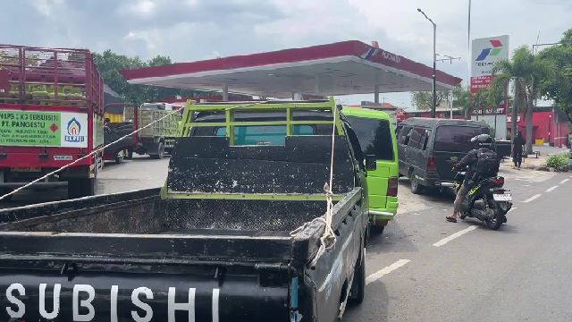 “sudah dari jam 9 sampai sekarang. oh, ini nunggu, ini nunggu ngisi itu. katanya 2 jam gitu. saya tunggu aja, kalau enggak tak tunggu, enggak kerja nanti. ya kerjanya ya... pencari bakul-bakul ini. tuh, kalau enggak antri ngene kan enggak bisa. enggak bisa kerja. oh, disini yang terus ada ini biasanya di sleko ini atau di pom dasin. ya sulit ya seperti ini. disemayani-semayani kadang enggak ada gitu ada,” ujar Triantono, sopir pick up.