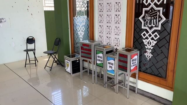 “tadi malam, perkiraan itu jam 12.00. jam 12.00 ke atas. nggih. ini semua, ada 5 ini, diambil semua. 5-limanya diambil semuanya. nggih. dicongkel, kayak gini semua. perkiraan kurang lebih 3 sampai 4 jutaan. 3 sampai 4 juta, nggih. malingnya lompat dari pagar sana, samping balai kota. lompat, terus lari ke sini. nggih, satu-satu, mulai dari ini, ini pertama. nggih. sudah terekam, hampir selesai semua. mungkin sadar ada cctv, lari ke membelokan di sana, ke cctv-nya. ciri-cirinya pakai hoodie hitam, agak tinggi,” ujar Syaiful Anam, takmir masjid.