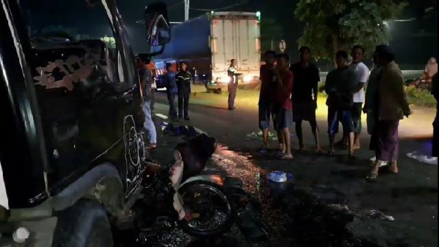 “dari belakang kan munteng kanan. iya. lah munteng kanan di depan ada kendaraan yang jalur sebelah. oh. akhire dibanting kiri, terus yang nyalip dari kiri ini bantingan yang kena saya itu. bumper yang kena. kalau kalau saya sekeluarga aman. alhamdulillah. truk yang kanan katanya patah kaki. patah kaki. kalau yang sepeda motor meninggal dua-duanya, nggih? dua-duanya,” ujar Sutain, saksi mata.