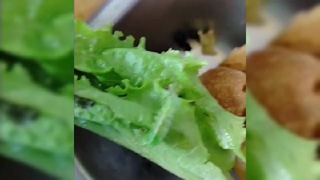 Di dalam ompreng makanan tersebut, terdapat ulat hijau berukuran besar menempel pada sayuran. Tak hanya itu, ulat tersebut bahkan mengeluarkan butiran-butiran hitam di samping menu tahu bakso.