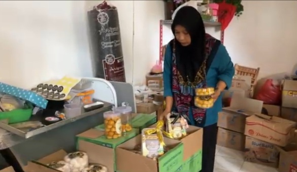 “di momen puasa mau idul fitri gitu ya, mas. ini dari online saja, dari wa, facebook, sama instagram. untuk tahun ini ada yang ke kalimantan, ke pati, sama ke denpasar. kalau yang denpasar itu tiap tahun pasti kirim. untuk paketan sementara 120 paket. kalau yang bijian belum... paling sekitar 100-an mungkin, sudah 100 lebih sih kalau yang bijian. kalau sehari, yang toples kecil itu bisa sampai 5 sampai 6 lusin. soalnya kita terbatas tenaga kerja ya. ya di h-10 itu, biasanya banyak yang nyari. kalau tahun lalu paketan lebih dari 300 ya. kalau yang bijian nggak ngitung, mas, paling murah ada di 60 sampai 100. itu yang untuk bijian ya. kalau yang paket, paket itu mulai 115 sampai 215, tergantung isi dan jenisnya,” ungkap Puji Setiawati, produsen kue kering.